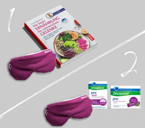- Paket 1: Spiegel-Bestseller „Die beste Ernährung für schmerzfreie Gelenke“ von Dr. med. Meike Diessner + Schlafmaske